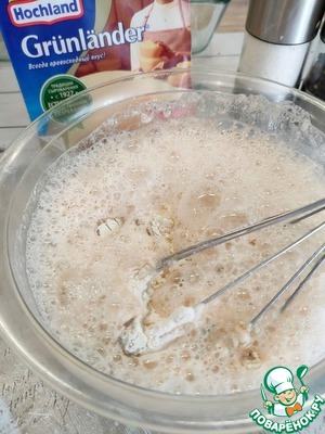 Влейте минеральную газированную воду и быстро перемешайте мучную смесь, чтобы пузырьки не успели выветриться. Должно получиться жидкое тесто.