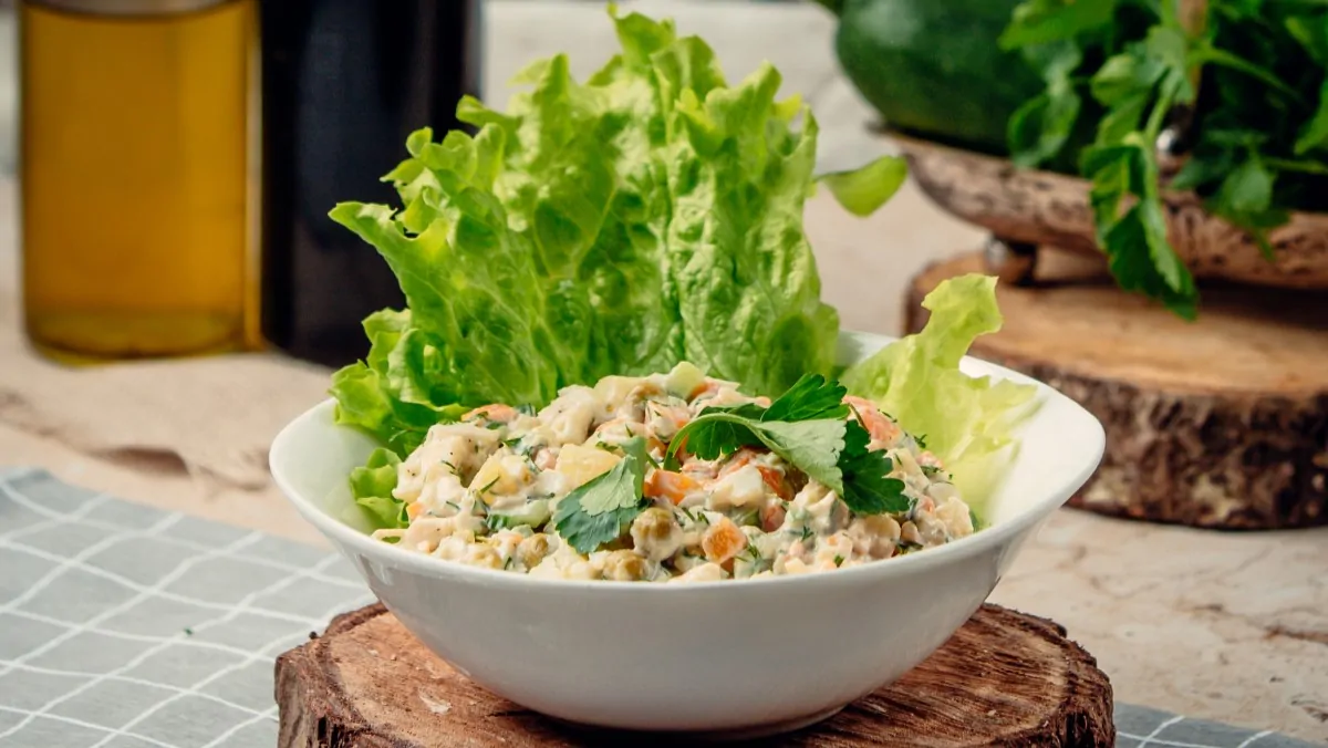 Салат можно украсить листовой зеленью. Блюдо получатся не только вкусным, но станет настоящим украшением праздника.