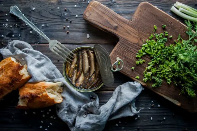 Слейте из банки со шпротами всю жидкость, выложите рыбу в отдельную емкость и разомните вилкой.