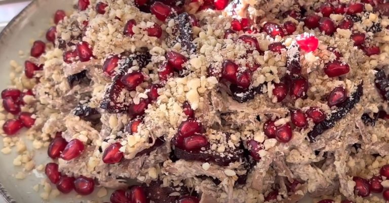 На дно салатника выкладываем волокна говядины, посыпаем крошкой грецкого ореха. Заранее следует отложить в чистую миску 3 столовых ложки ореховой крошки.