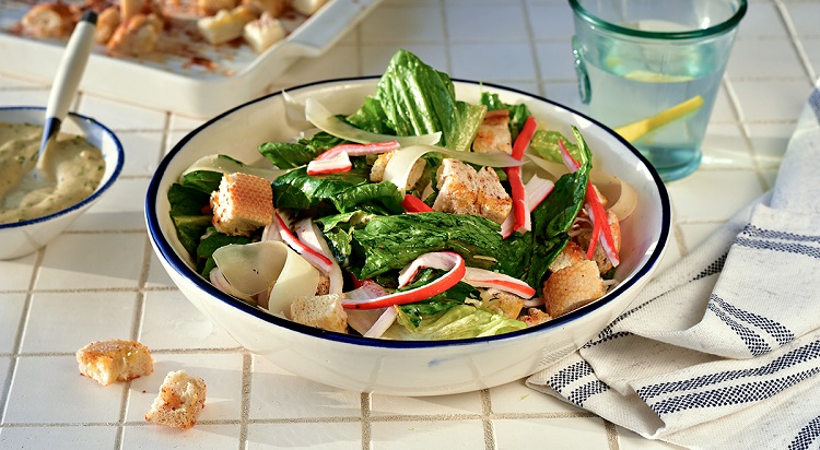 Сверху разложите тонкие полоски крабовых палочек и ломтики сыра, посыпьте сухариками и полейте блюдо парой ложек приготовленного соуса. Лучше подавать салат сразу после того, как заправили, чтобы сухарики не размокли, и листья зелени не потеряли форму.