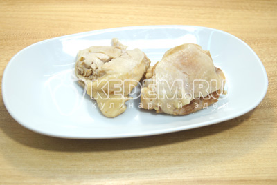 Куриные бедра отварить до готовности и остудить. Отделить мясо от костей.
