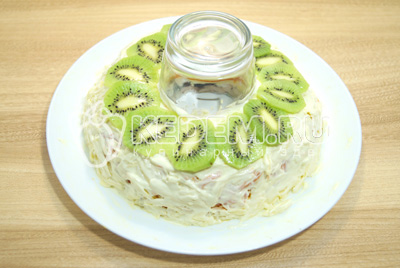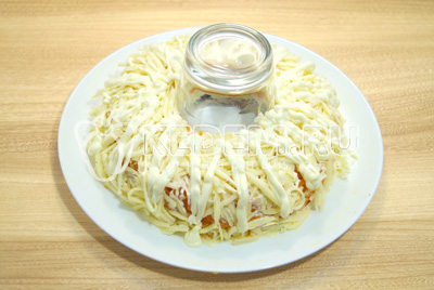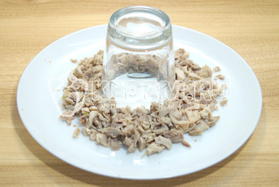 Мелко нарезать куриное мясо и выложить на блюдо вокруг стакана.