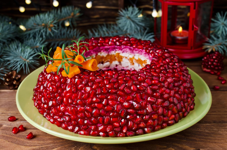Потихоньку вынимаем стакан. Обмазываем верх салата майонезом и равномерно посыпаем зернышками граната. Отправляем салат в холодильник пропитываться.