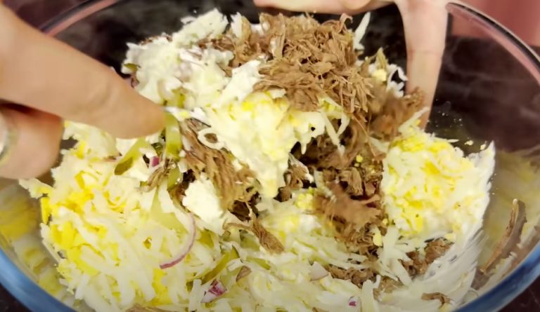 Отвариваем говядину в соленой воде до готовности, охлаждаем и измельчаем на волокна.