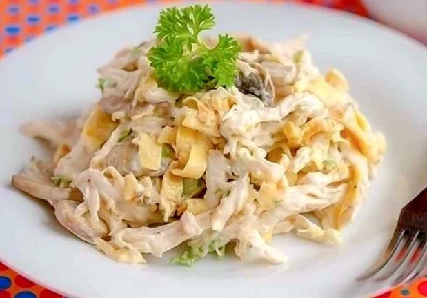 В отдельной посуде взбейте яйца с молоком, немного посолите и обжарьте на сковороде, как омлет. Когда омлет остынет, нарежьте его полосками. Смешайте все ингредиенты и заправьте майонезом, добавьте перец и соль по вкусу.