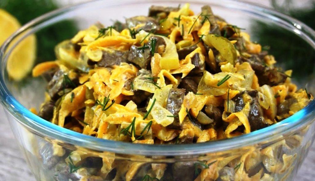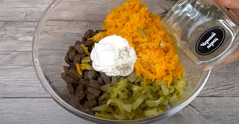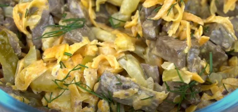 Говяжью печень можно заменит свиной, если не любите жаренную, тогда отварите в подсоленной воде, остудите и порежьте мелкими кусочками.