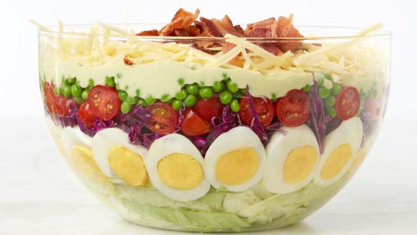 Седьмой слой в центре горкой нарезанную прожаренную ветчину (бекон).