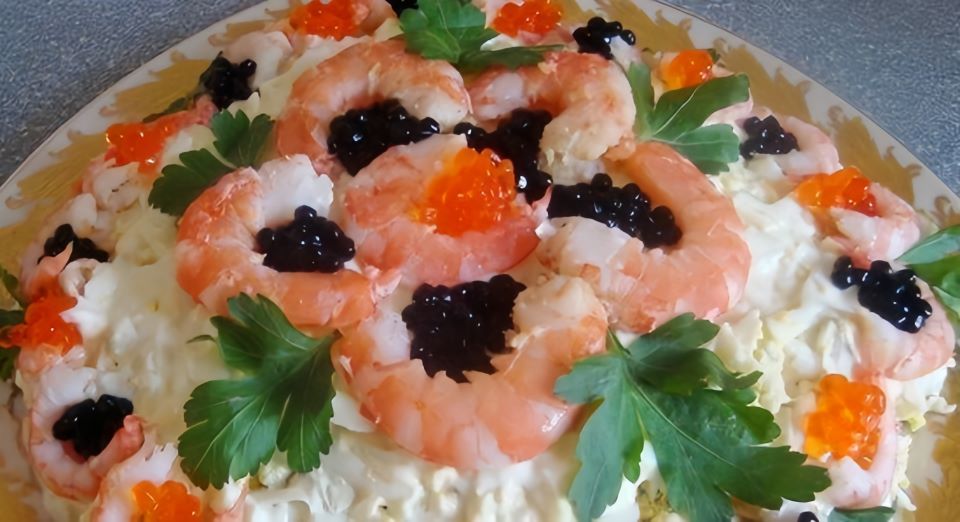 Только последний сырный слой необходимо обильно смазать майонезом. По всему салату разложить в виде цветочков креветки. В серединку каждого цветочка разместить ½ ч. л. черной икры. Оставить на 30-60 минут для пропитки.