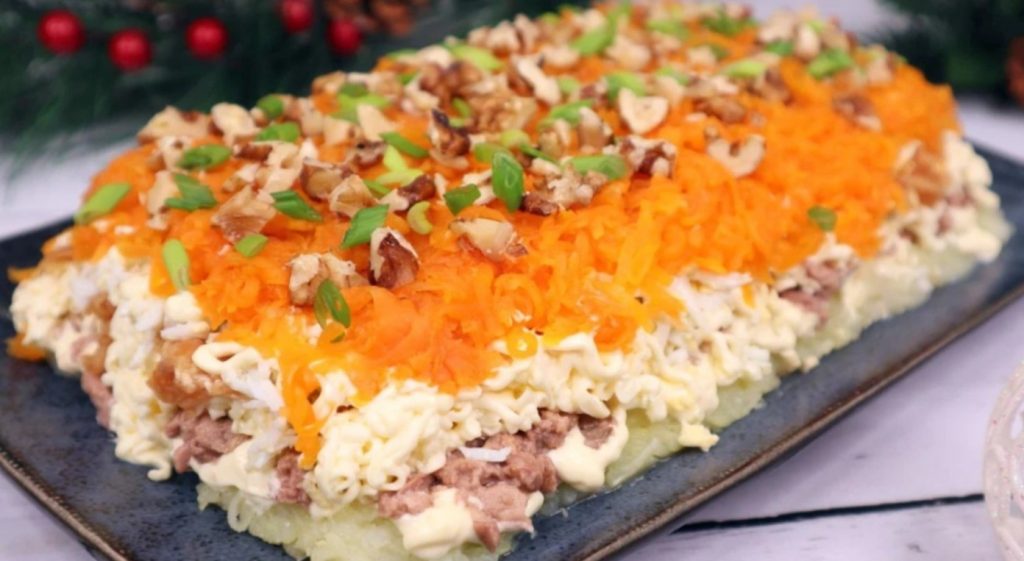 Остается только декорировать салат грецкими орехами и подавать к столу.