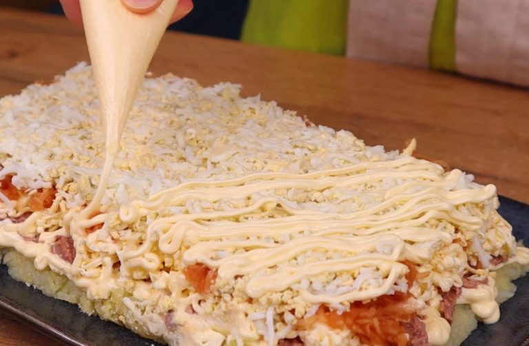 Все слои салата нужно смазывать столовой ложкой майонеза.