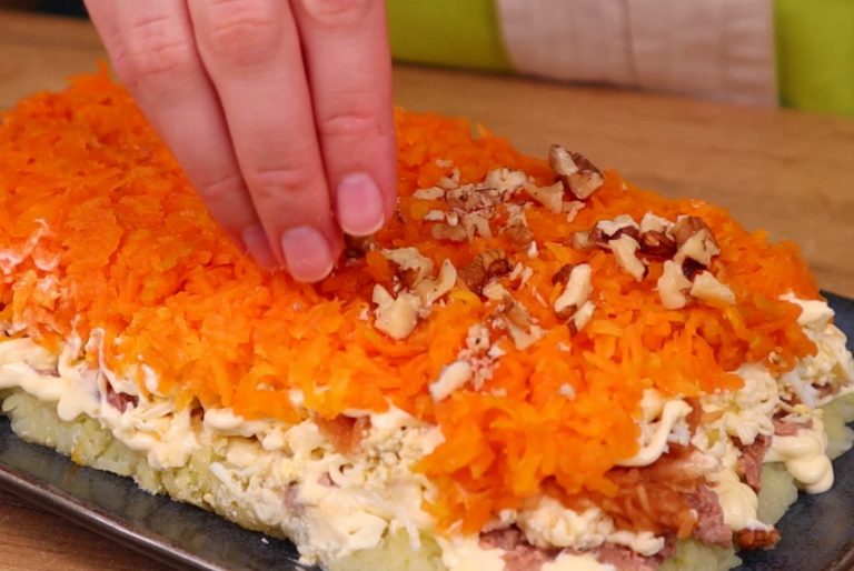 Отваренную морковь, как и остальные ингредиенты, пропускаем через терку и распределяем по поверхности салата.