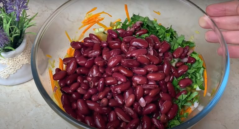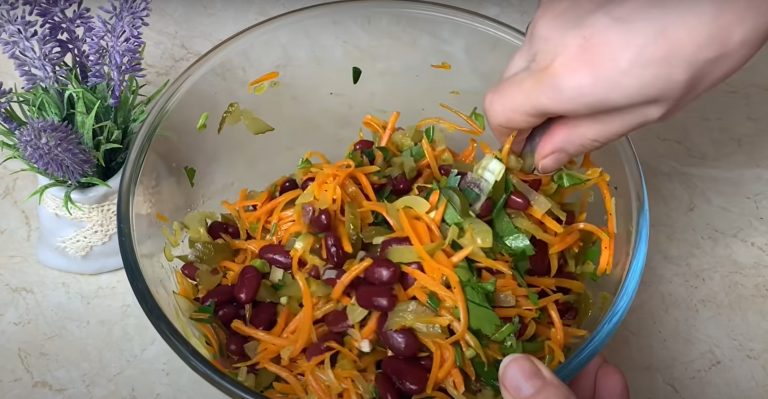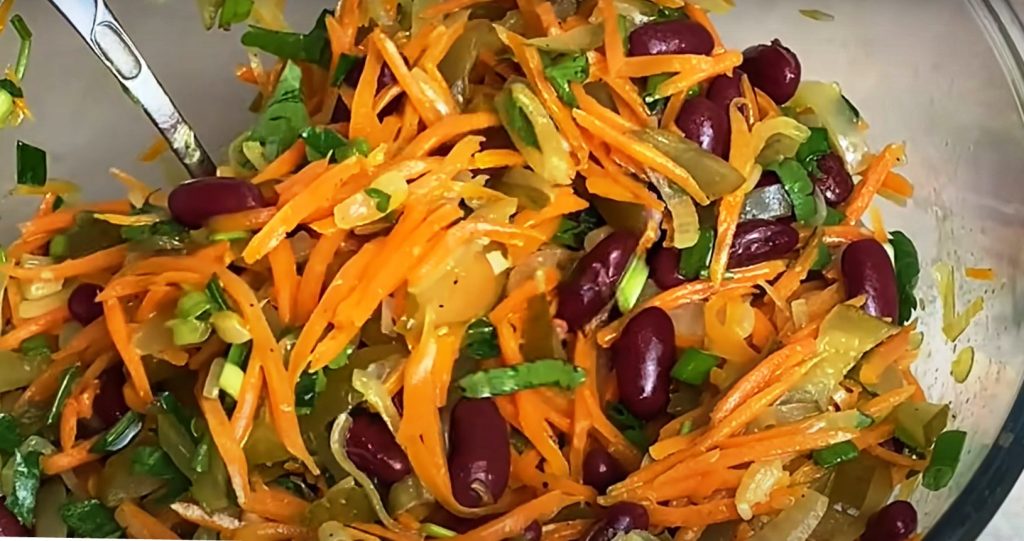 Нарезаем тонкими слайсами соленые огурцы и смешиваем в салатнике со слегка обжаренными морковью и луком. Шинкуем зеленый лук, вместе с фасолью высыпаем в салатник.