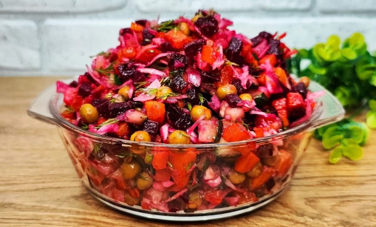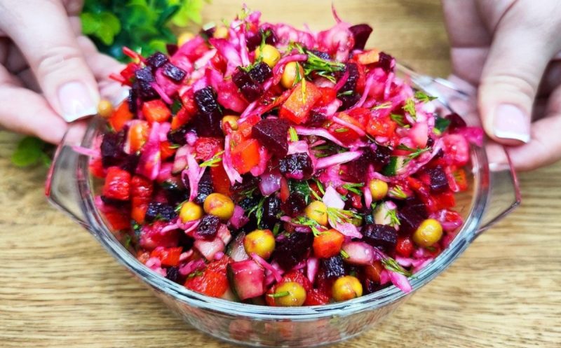 Выкладываем в массу из овощей лук и отправляем салат к свекле.