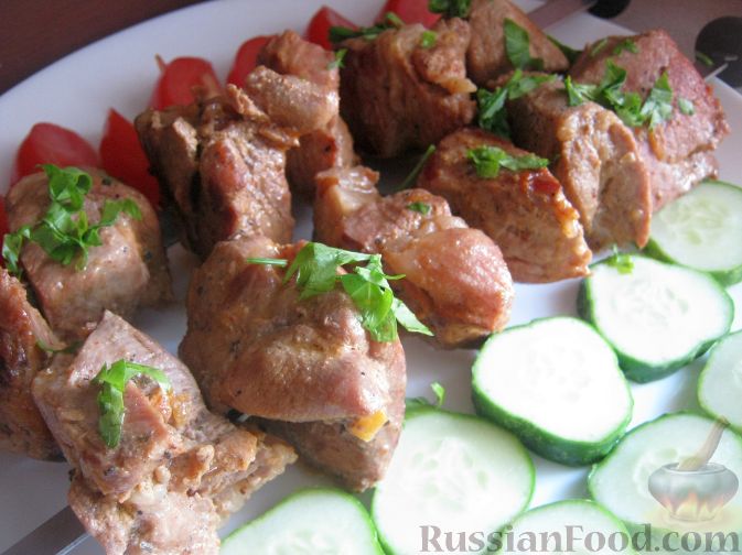 Жарить шашлык любым способом (на мангале, в сковороде, в духовке, в электрошашлычнице), сбрызнув мясо слегка перед готовкой лимонным соком. Подавать со свежими овощами.