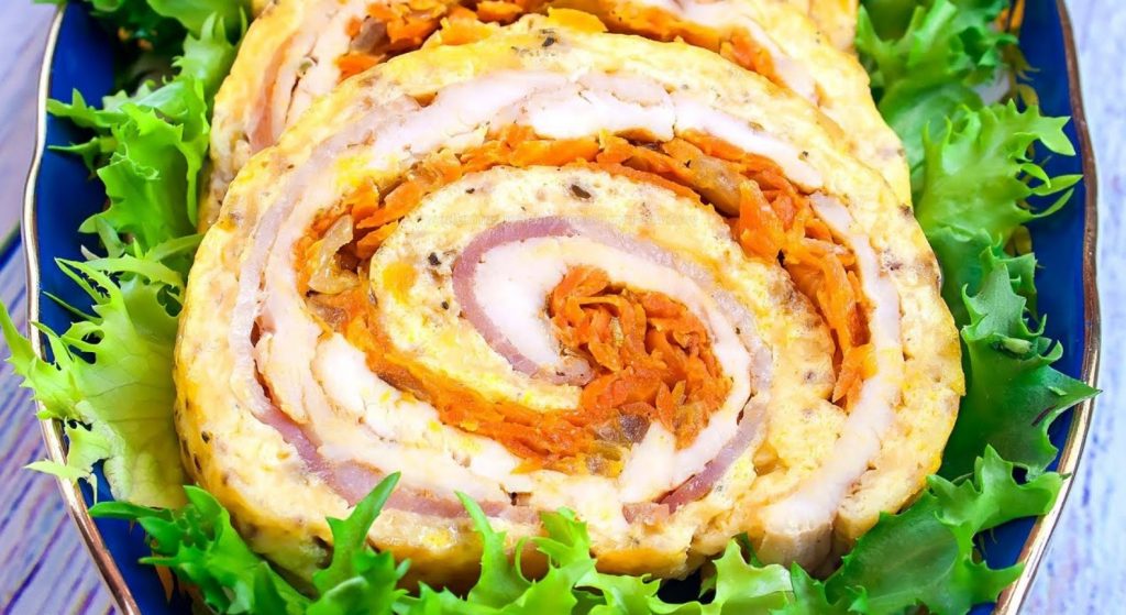 Совет: чтобы добиться идеальной толщины мясного слоя, накройте его пленкой и пройдитесь по нём скалкой. Сверху выкладываем ломтики сыра, но не весь мясной слой покрываем сыром. Оставьте непокрытыми 10 сантиметров. Теперь то же самое проделайте с ветчиной. Следующий слой – обжаренный лук и чеснок. Его следует нарезать перед жаркой тонкой соломкой.