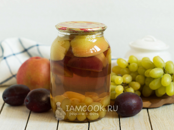 Этот компот хорош тем, что есть поле для вариаций — можно взять разные сорта яблок, винограда, слив и получить совершенно разный вкус напитка! Компот готовится очень просто. Фрукты очищаются, закладываются в стерильную банку и путем двойной заливки (сначала — чистой водой, затем — сиропом) готовится компот.
