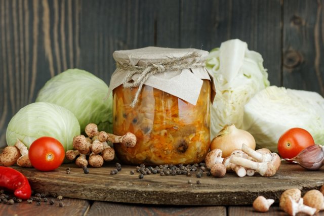 За 5 минут до готовности добавьте в солянку лавровый лист, перец и влейте уксус, хорошо перемешайте. Готовую солянку разложите в стерилизованные банки и закатайте.