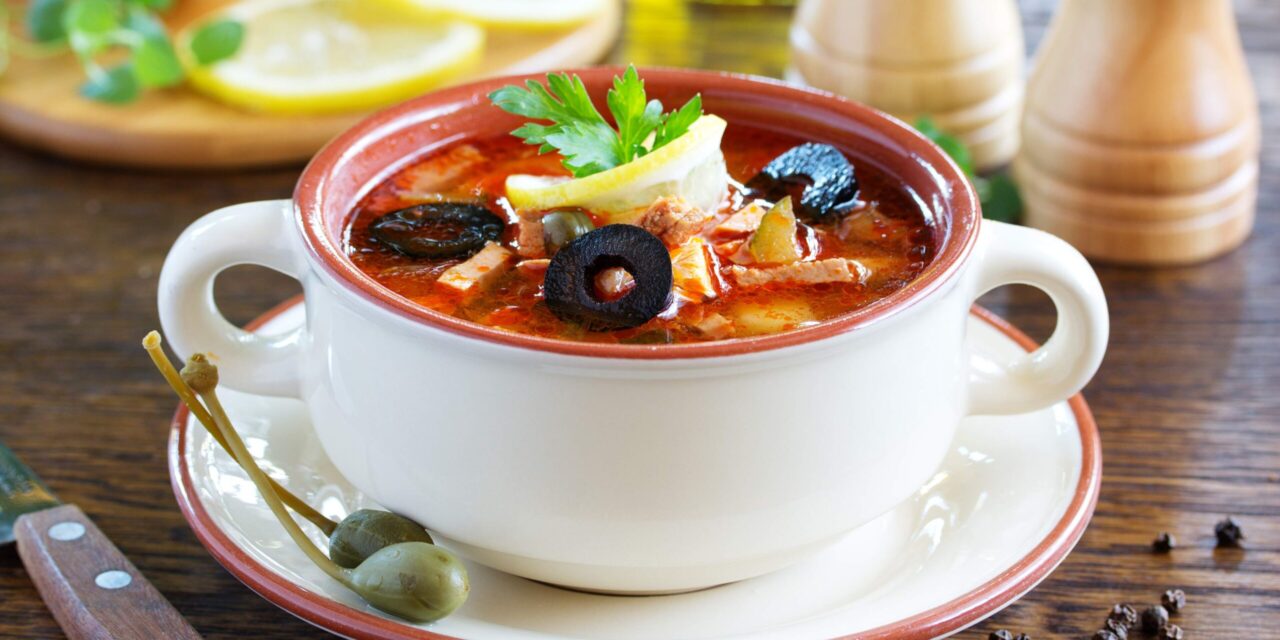 Закиньте в суп оливки, влейте рассол и размешайте. Добавьте немного соли и перца. Солите только после добавления рассола. На этом шаге можно добавить каперсы. Через 4–5 минут снимите солянку с огня и оставьте под крышкой на 15 минут. При подаче добавьте сметану, лимонные ломтики и немного зелени.