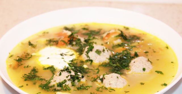 Рассольник с пшеном и фрикадельками советую подавать со сметаной и рубленой зеленью