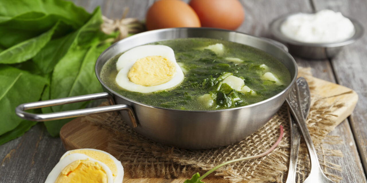 Яйца несколько шт.Картофель 3–4 шт.Репчатый лук 1 шт.Сельдерей 1–2 стебляЩавель 80–100 гЧеремша 50 гРастительное масло 2 ст. л.Соль по вкусуКуриный бульон 1 800 млСметана по вкусуУкроп, петрушка или зелёный лук ½ пучка