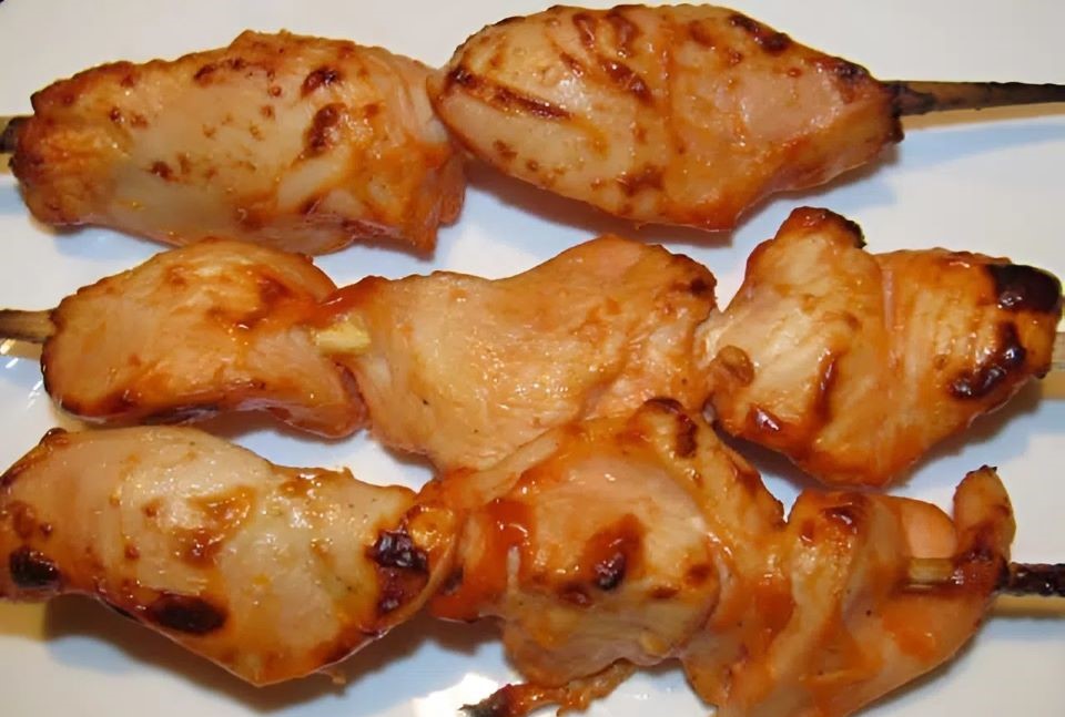 Курицу надеть на шпажки. Поставить куриный шашлык на шпажках в духовку, разогретую до 180 градусов, на 30 минут.