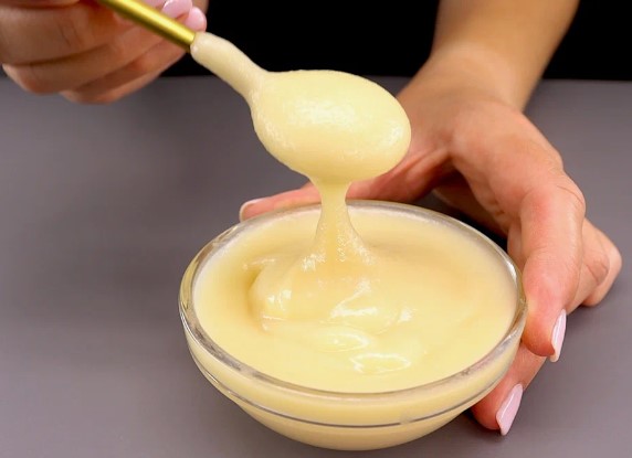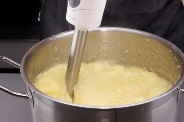 Перебиваем массу погружным блендером до состояния пюре и вливаем сгущенку, перемешиваем.