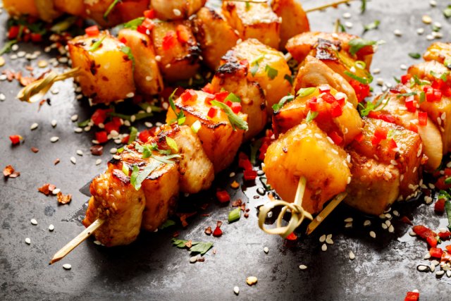 Мясо курицы разделите на порционные куски, можно – вместе с кожицей. Натрите их солью и приправой, положите в глубокую емкость. С ананаса срежьте верхушку и разрежьте его на несколько частей так, чтобы удобнее было снимать кожуру. Всю полученную мякоть разделите на две части. Одну из них поместите в соковыжималку и выжмите из нее сок. Вторую нарежьте порционно, крупными кусками – так, чтобы их было удобно нанизывать на шампуры вместе с курицей. Кусочки ананаса поместите в посуду к мясу, влейте сок и хорошо перемешайте. Отправьте емкость в холодильник на полчаса. Затем нанижите мясо на шампуры, перемежая его с кусочками ананаса. Жарьте шашлык на мангале, периодически переворачивая его и поливая оставшимся маринадом. Время жарки составит примерно 15-20 минут.
