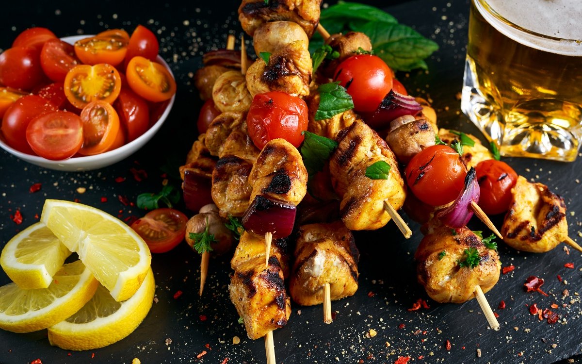 Мясо курицы нарежьте кусочками, натрите солью и специями. Положите в глубокую емкость. Лук очистите и нарежьте пластинками такого размера, чтобы их можно было нанизать на шампуры вместе с мясом. Промытый лимон нарежьте дольками и вместе с луком положите к мясу. Промытую зелень мелко нарежьте и тоже добавьте к мясу. Хорошо, но аккуратно перемешайте. Залейте мясо минеральной водой и снова перемешайте все компоненты. Поставьте емкость с мясом в холодильник на полчаса. Томаты черри промойте и немного обсушите бумажным полотенцем. Достаньте из холодильника посуду с мясом и нанижите его кусочки вместе с луком и томатами черри на шампуры. Готовьте шашлык на мангале, периодически переворачивая, чтобы мясо равномерно прожарилось. На это уйдет около 20 минут.