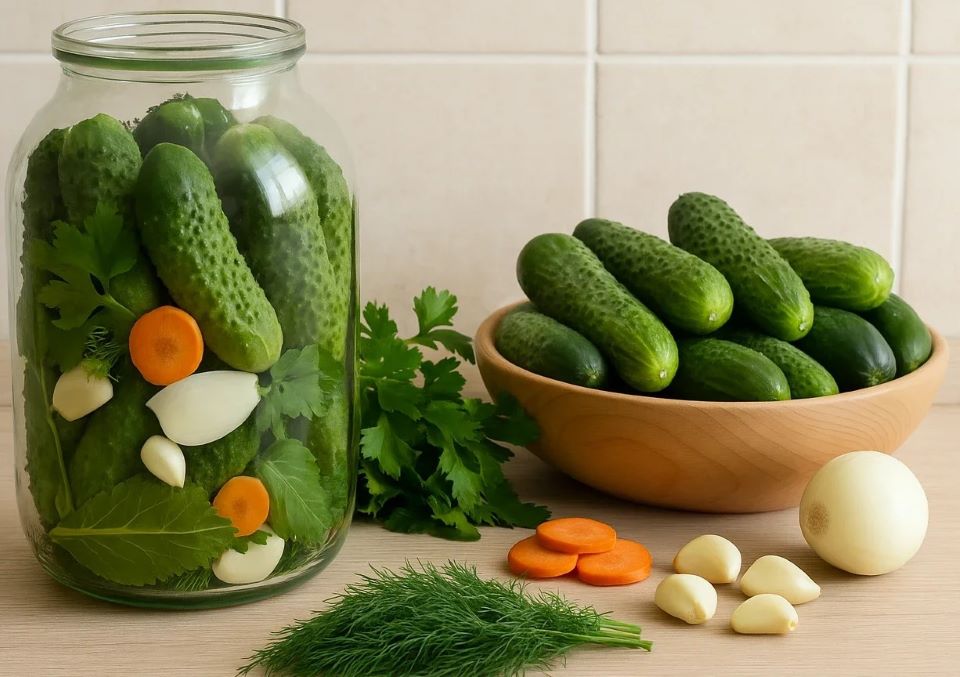 Сначала тщательно вымойте все ингредиенты и простерилизуйте банки. На дно каждой тары уложите лист хрена, зелень (укроп и петрушку), кольца лука, половинки зубчиков чеснока, кружки моркови и при желании — немного острого перца. Этот слой придаст овощам характерный белорусский аромат и устойчивость к порче.