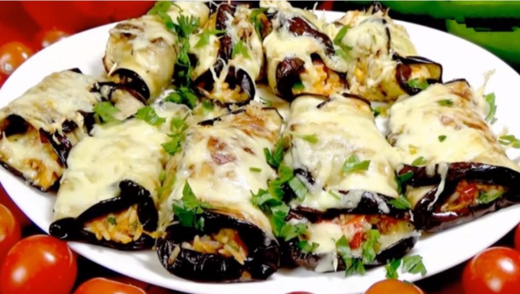 Форму для запекания застилаем пергаментом и смазываем растительным маслом. Выкладываем рулеты, посыпаем тертым сыром и запекаем при 200 градусах около 10 минут.