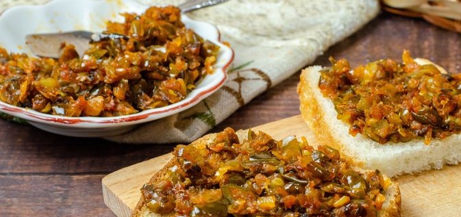 Выдавливаем в сковороду зубчик чеснока. Всыпаем перец и сахар. Перемешиваем, тушим ещё 1-2 минуты и выключаем нагрев. Икра из солёных огурцов готова.