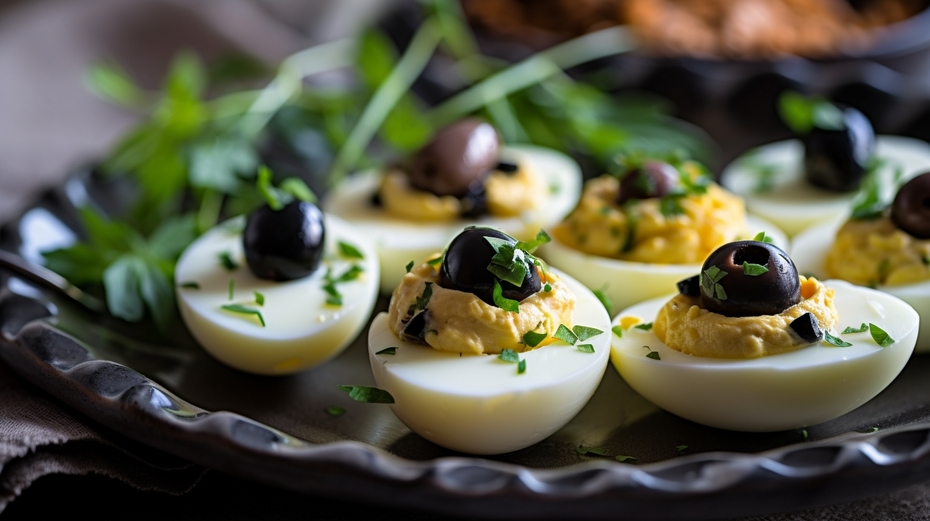 Получившейся смесью фаршируем половинки яичных белков, так, чтобы получилась небольшая горка. Затем в начинке поперек каждого яйца зубочисткой делаем небольшое углубление, куда укладываем нарезанные на четвертинки маслины, так, чтобы получился вертикальный «зрачок», как у кошки. Огурец нарезаем с помощью овощечистки на длинные тонкие слайсы и оборачиваем вокруг сырной начинки.