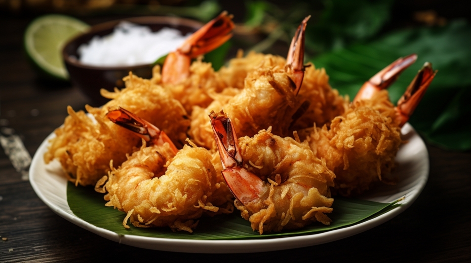 С сырых креветок необходимо снять панцирь, но обязательно оставить хвостик. В миске смешать охлажденную воду, специи, муку и вбить куриные яйца. Перемешать миксером, чтобы получилось тесто. Кокосовую стружку высыпьте ровным слоем на тарелку.
