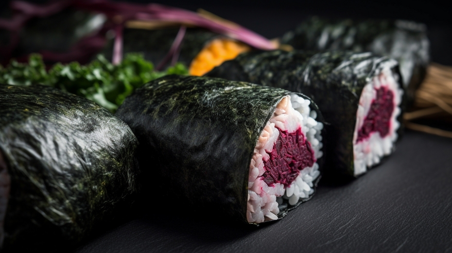 Овощи и яйца отварить до готовности, остудить, очистить и натереть на терке. Лук нарезать полукольцами и замариновать. На циновку для роллов кладем пищевую пленку, сверху — лист нори, гладкой стороной вниз. Выкладываем на него свеклу так, чтобы с одного из краев осталось пустое место шириной около 1 см — это поможет потом закрепить нори. Солим, смазываем майонезом. Сверху выкладываем тонкий слой моркови, соль и снова майонез. Затем картофель, соль и сельдь с луком.