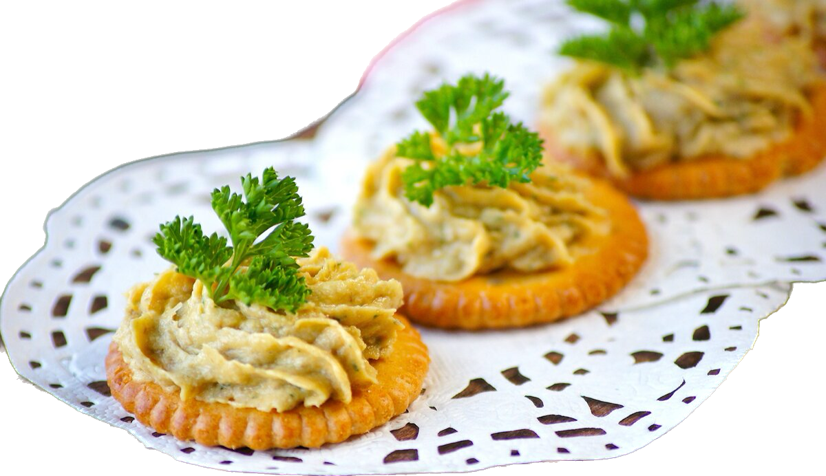 На крекеры выкладываем закуску, формируя чайной ложкой небольшой купол, в верхушку которого втыкаем листок петрушки.