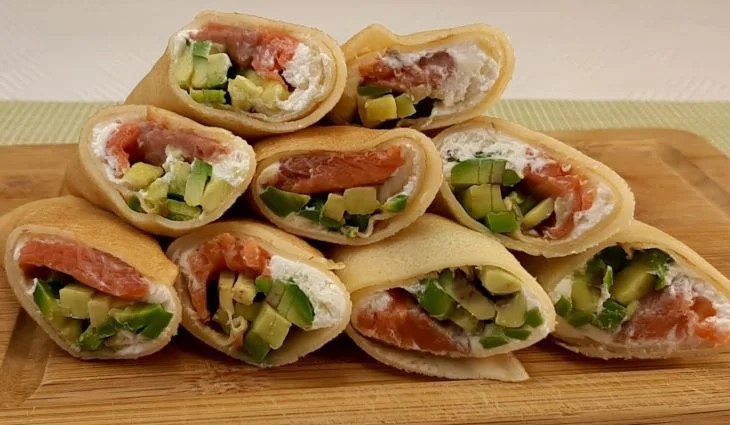Авокадо или огурец (по желанию) почистить и некрупно нарезать. Примерно половину блина смазать творожным или сливочным сыром. Положить полоску соленой рыбы. Добавить столовую ложку нарезанного авокадо, также выкладывая его вдоль рыбы в полоску. Затем свернуть рулет потуже, чтобы получилась плотная трубочка. Для подачи ее можно разрезать пополам, либо нарезать на роллы.