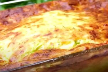 Сыр натереть на крупной терке, духовку разогреть до 220 градусов. Залить сметаной запеканку и отправить в духовку. За 5 минут до готовности достать блюдо, посыпать тертым сыром и рубленной зеленью для аромата, убрать запекаться до готовности.